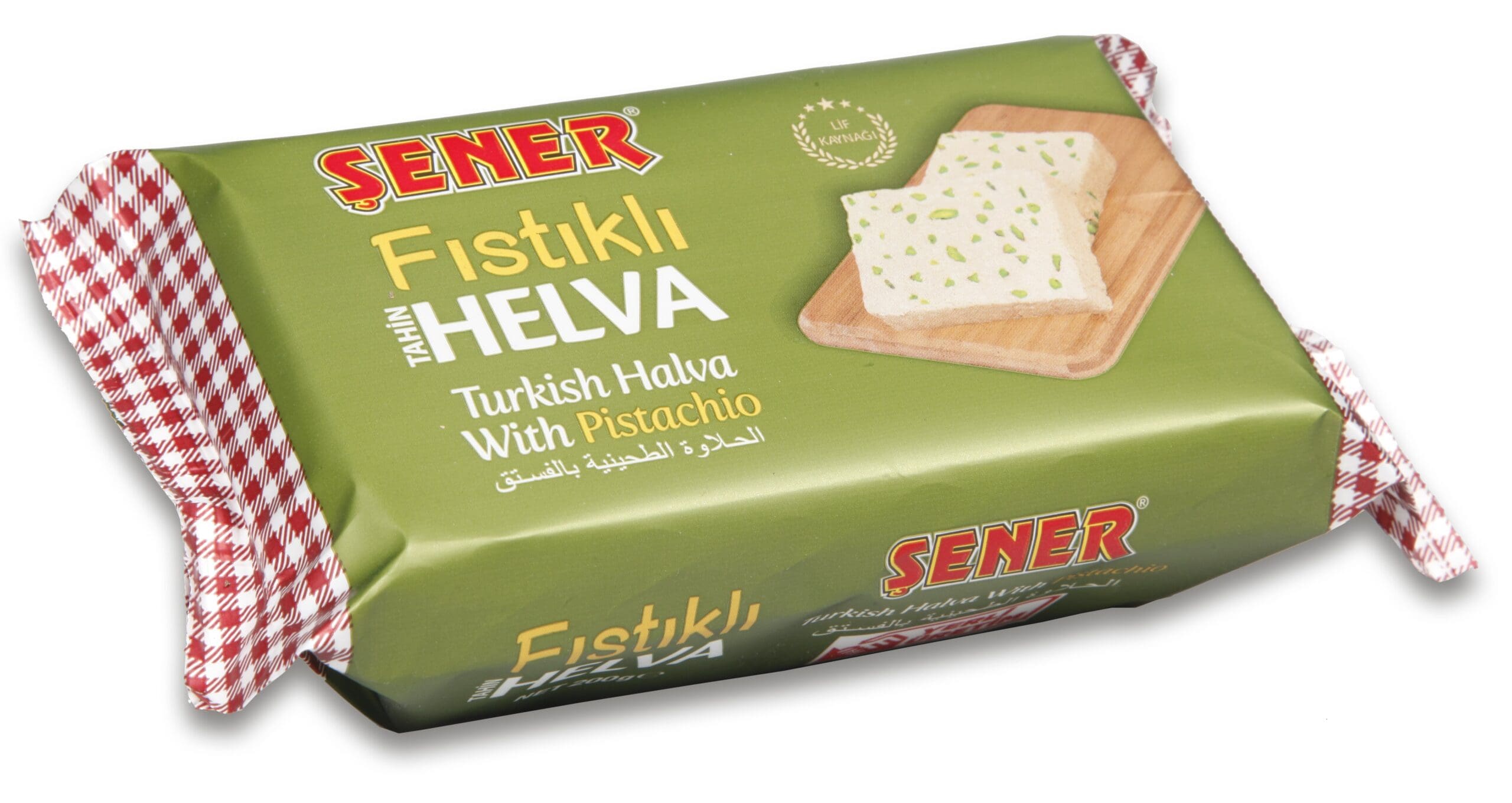 Şener Helva’nın lezzetli ürünleri arasında bulunan 200 gramlık fıstıklı helva, içindeki doğal fıstık parçacıklarıyla birlikte sunulur